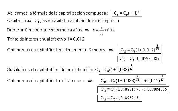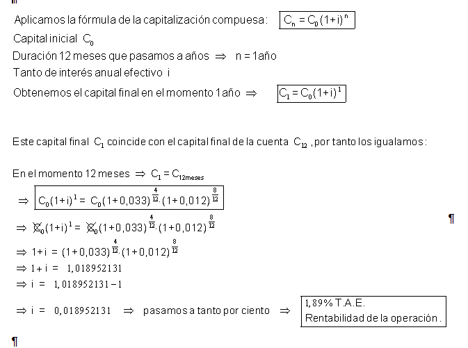 Vamos a calcular la rentabilidad (Tanto Anual Efectivo, T. A. E.) obtenida en una inversión a un año para cualquier capital, si invertimos en dos productos financieros con distintos tantos de interés; primero un depósito durante 4 meses al 3,30% T.A.E. y a continuación en una cuenta durante 8 meses al 1,20% T.A.E.